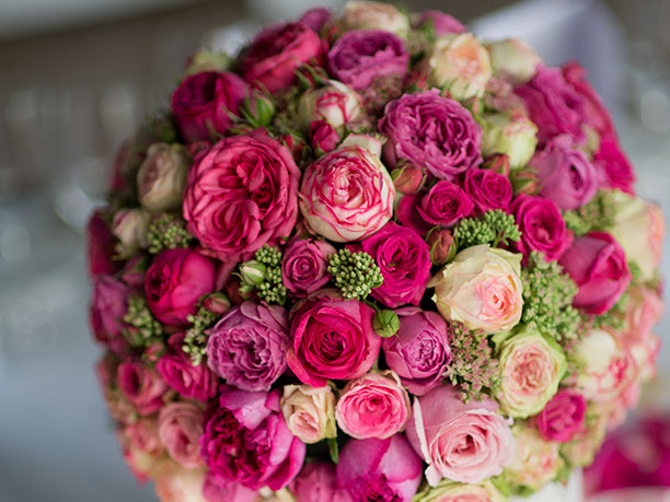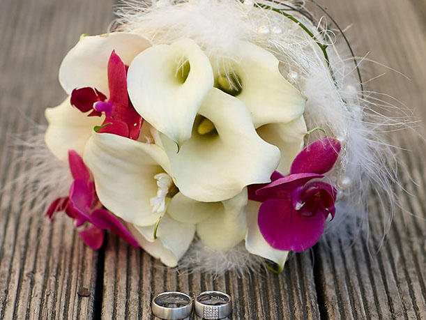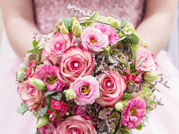 vom Brautstrauß mit korrespondierendem Anstecker mit Tischdeko, Kirchenschmuck, an das Fahrzeug denken wir auch und und und, damit der Tag in bester Erinnerung bleibt.